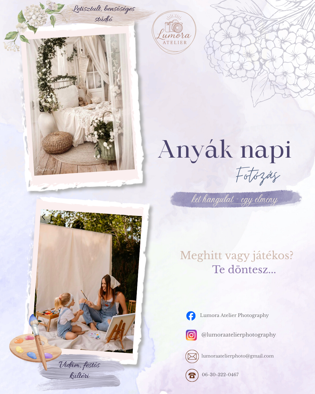 Gyertek el hozzám anyák napi fotózásra és válasszátok azt a hangulatot, ami a legközelebb áll a szívetekhez. Ha pedig nem tudtok választani, akkor lehetőségetek van arra is, hogy mindkét világot megéljétek egy fotózáson belül!